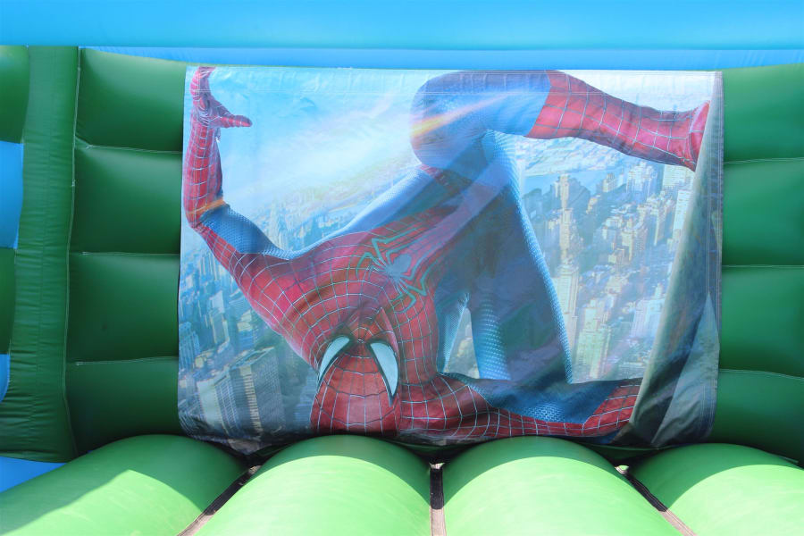 Spiderhero Fans will go crazy for our Spiderhero themed Bouncy Castle with side slide combo!