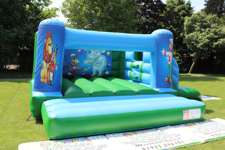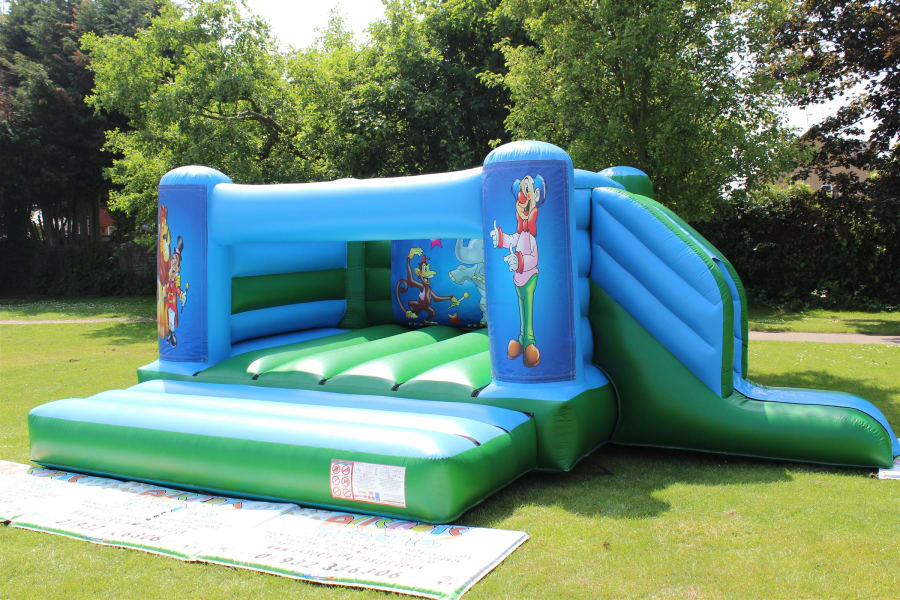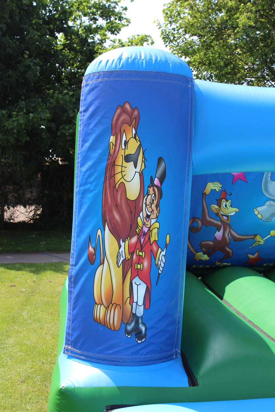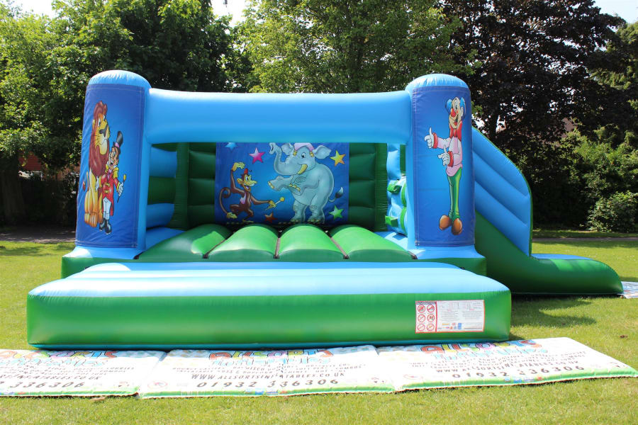 Ideal bouncy castle with side slide for corporate events, mixed gender parties and for those who have a neutral or circus party theme.