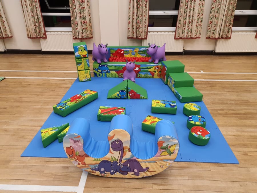 Package includes a 10ft wide x 12ft deep bouncy castle, 17 piece softplay set, 1 x double rocker, 3 x ride on dinosaurs and a foam ballpond with 300 balls, all beautifully themed with matching dinosaur artwork, and all layed out on a softplay mat.