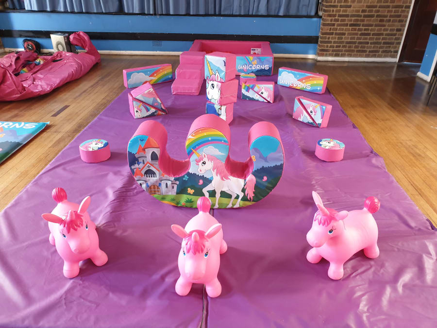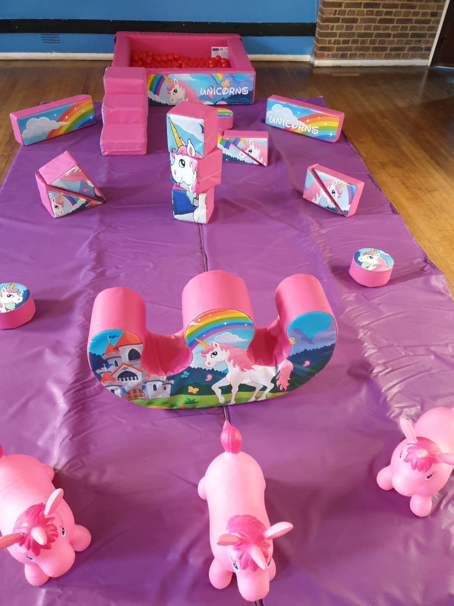 Includes a 17 piece soft play set, a double rocker, 3 x ride on bouncy unicorns and a foam ball pond, all beautifully themed with matching unicorn artwork, and all laid out on soft play mat