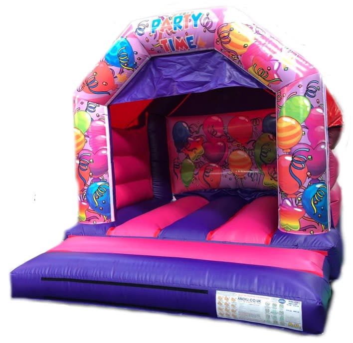 Pink and purple partytime bouncy castle
