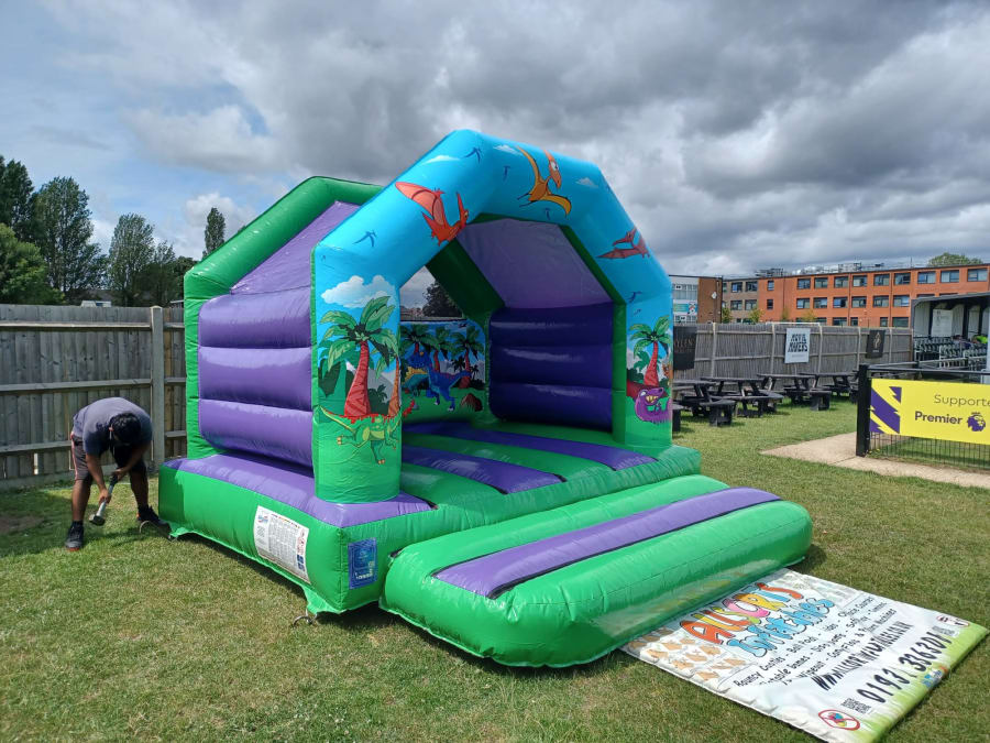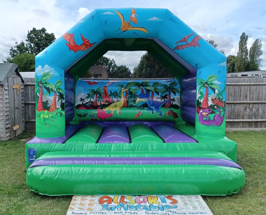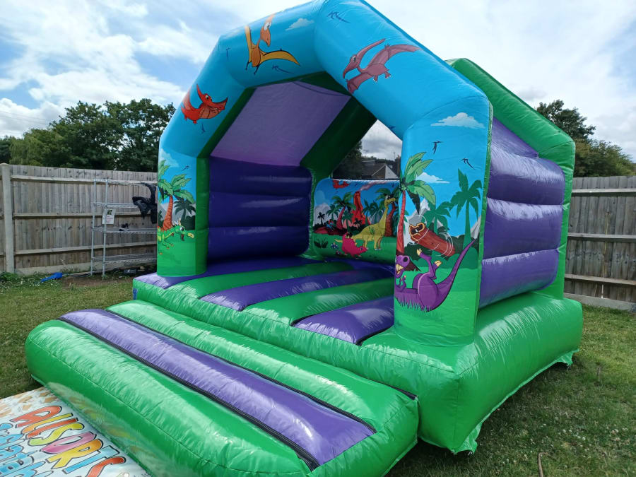 Fully themed Dinosaur Bouncy Castle with stunning Artwork and a fully fitted raincover.