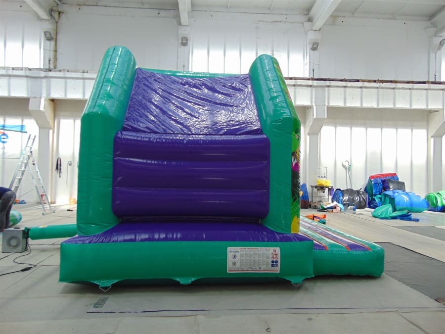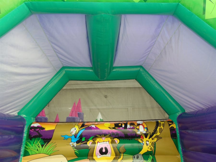 Neutral jungle themed bouncy castle perfect for the bigger parties and events all under a nicely fitted raincover.