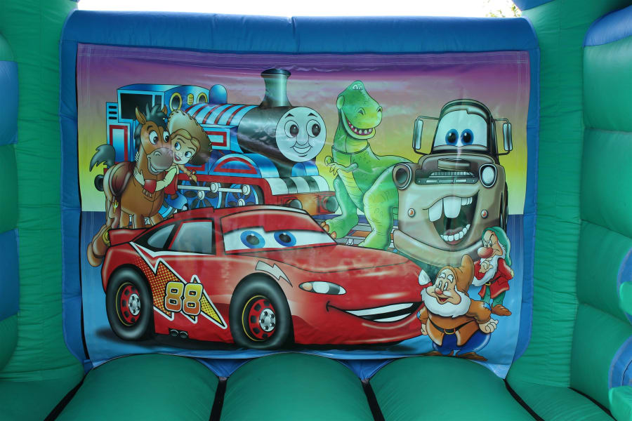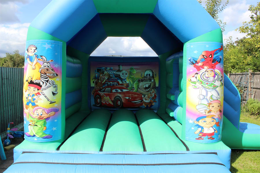 Hire our Mixed character Bouncy castle/slide combo with roof so rain or shine your party will still be a success!