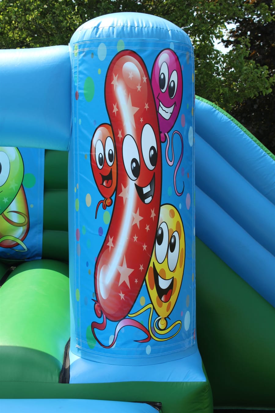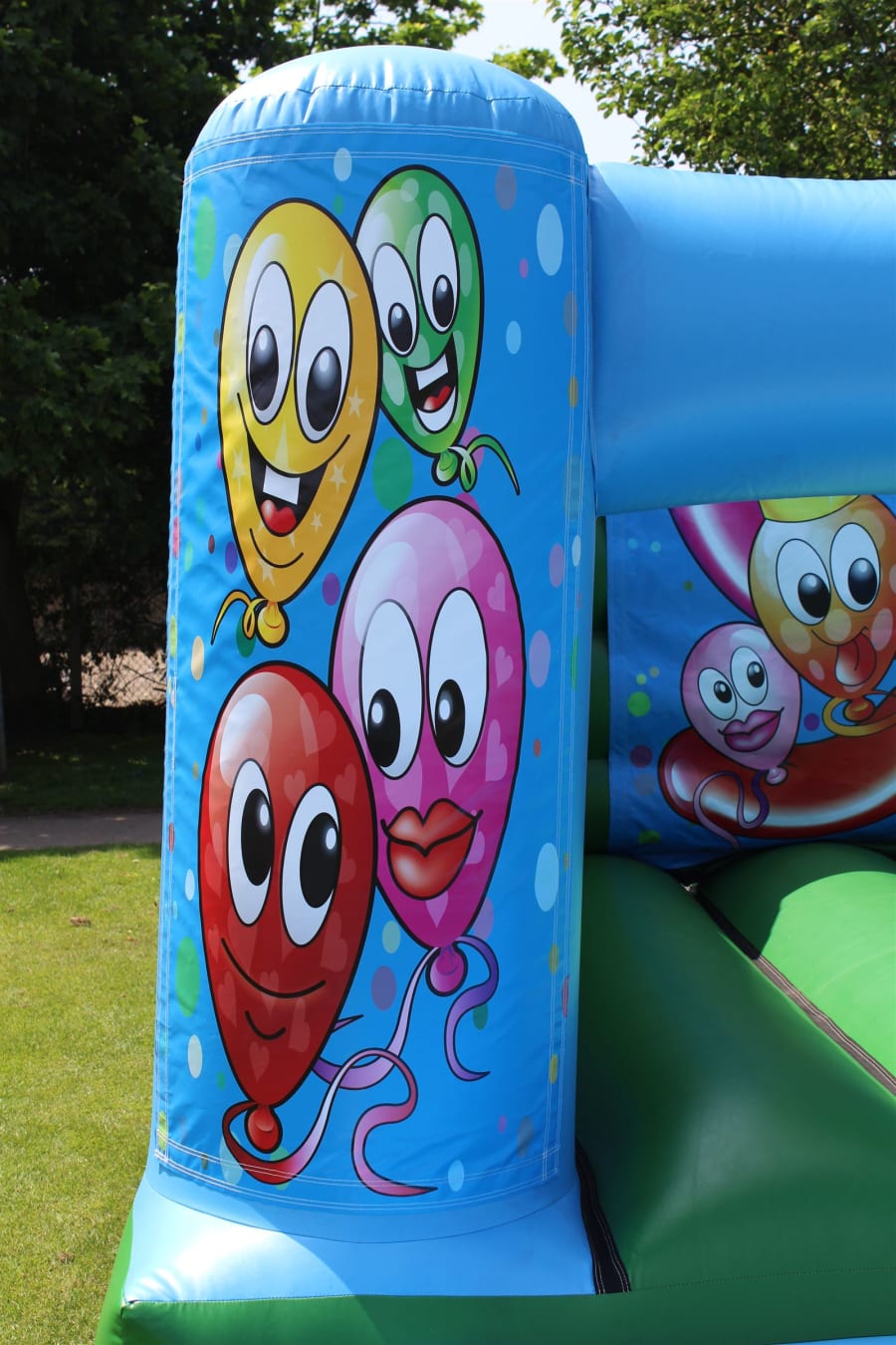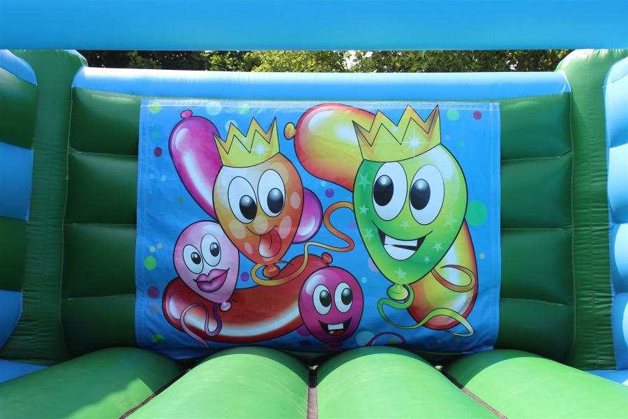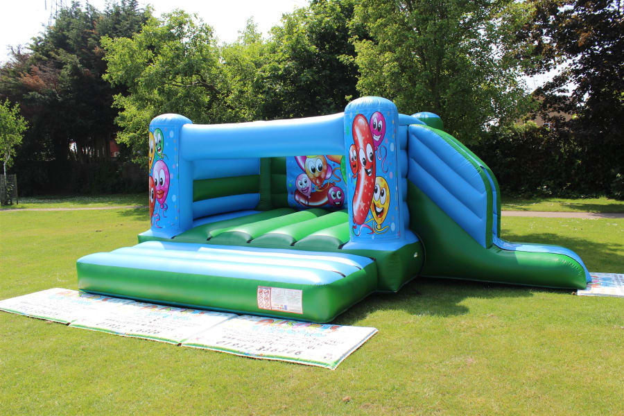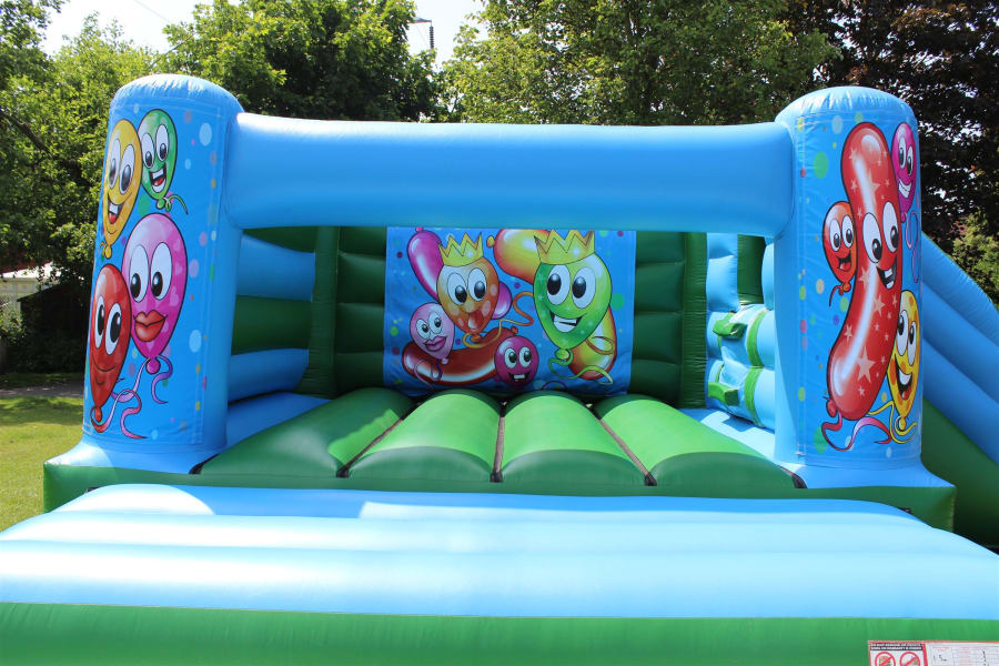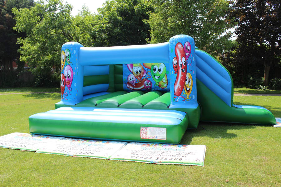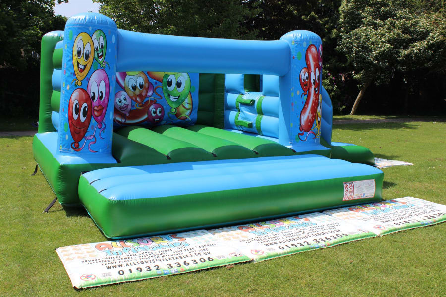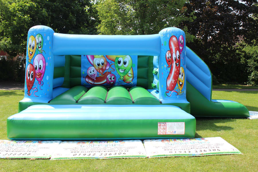 Happy Balloons Bouncy Castle with side slide for hire in Surrey and surrounding areas.