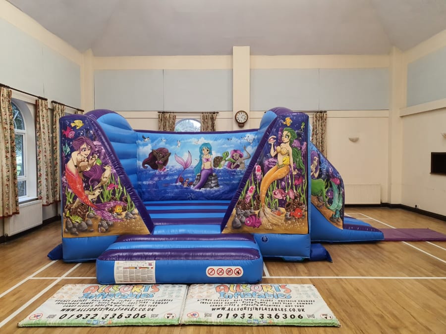 We also have this mermaid theme available as a bouncy castle with side slide as well as a matching soft play set and mermaid themed packages available. Please see the links above or give us a call on 01932 336306