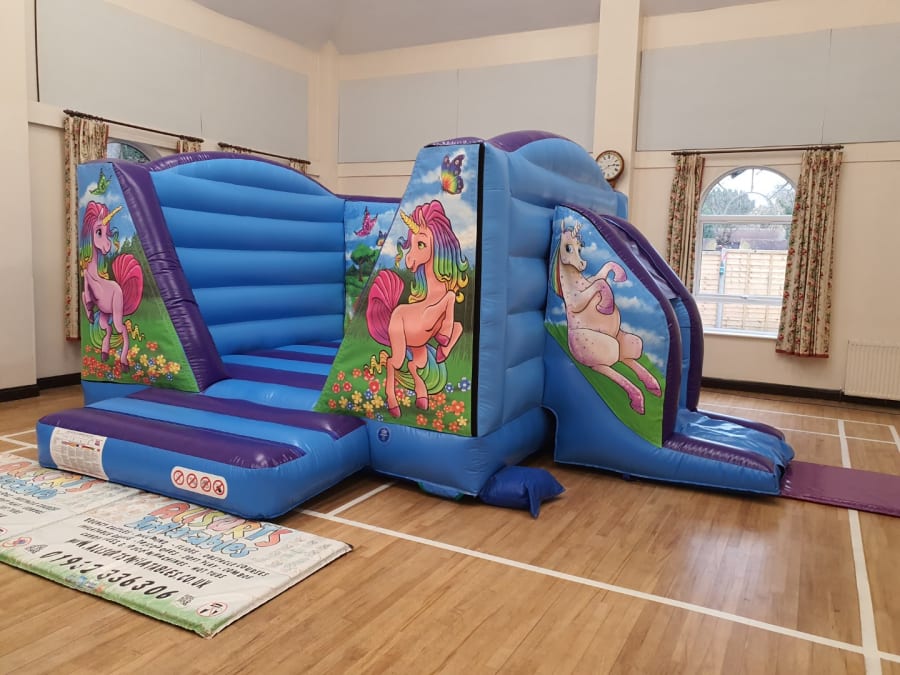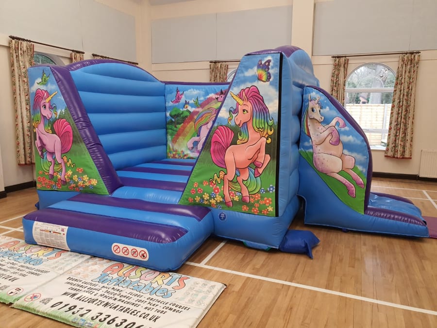 Stunning Unicorn themed bouncy castle with side slide combo, the unit comprises of a nice size bouncing area with the added bonus of a side slide to double the fun.