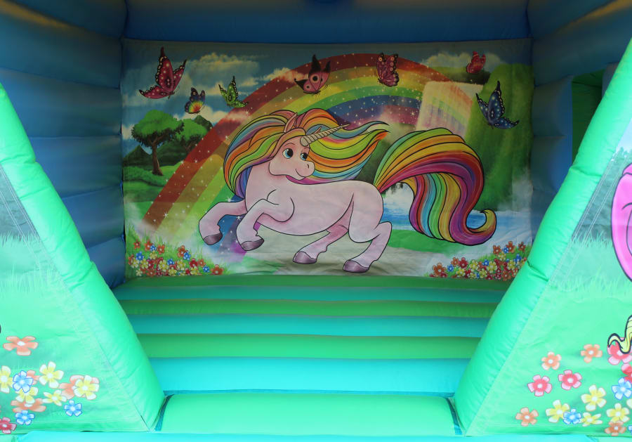 Stunning Unicorn themed bouncy castle with side slide combo with fitted rain cover, the unit comprises of a nice size bouncing area with the added bonus of a side slide to double the fun.