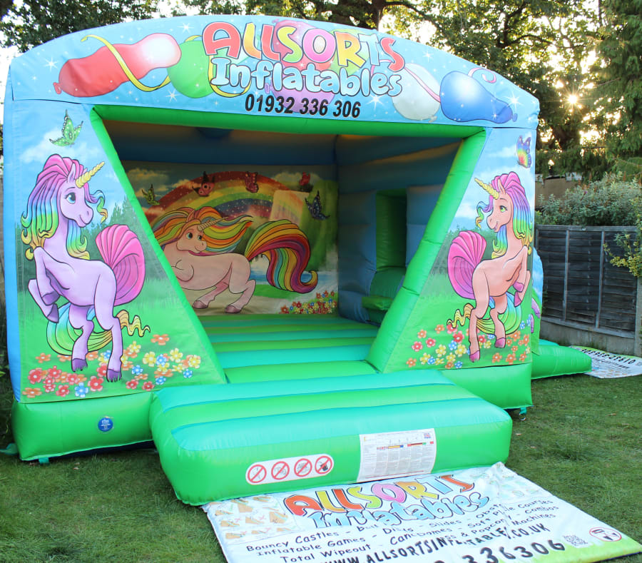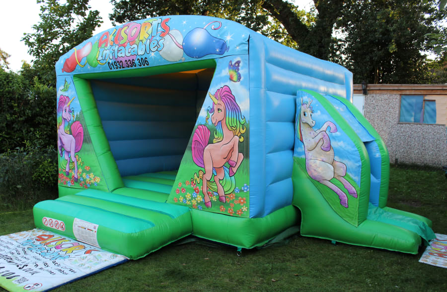 Unicorn Themed Bouncy Castle With Side Slide For Hire in Surrey and Surrounding Areas