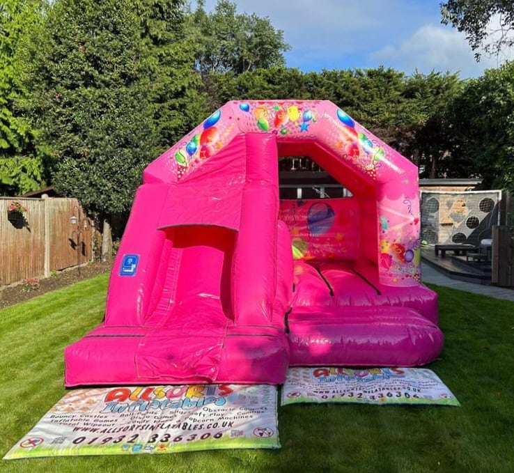 Bright coloured bouncy castle with front slide and a fitted rain cover.