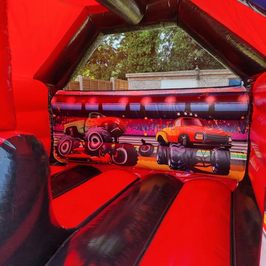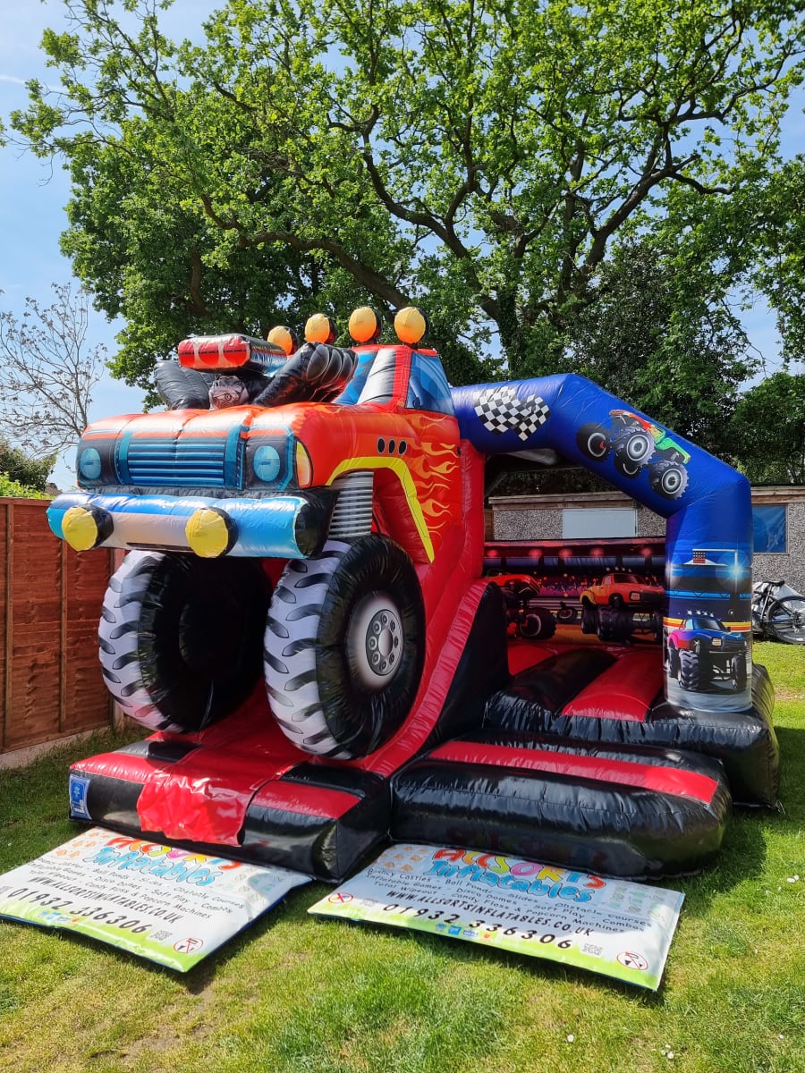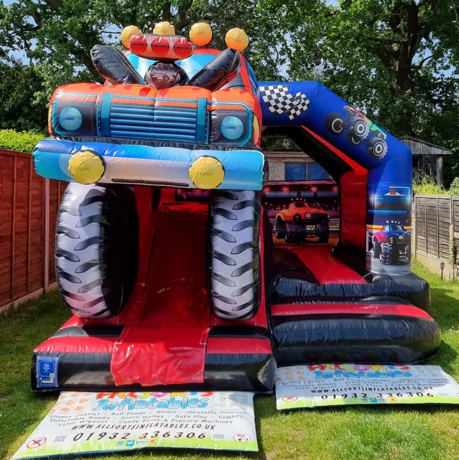 We have done it again with our amazing new custom made bouncy castle slide combo this time with a 3d Monster Truck theme, this is only available from us at Bouncy Castle hire Surrey!