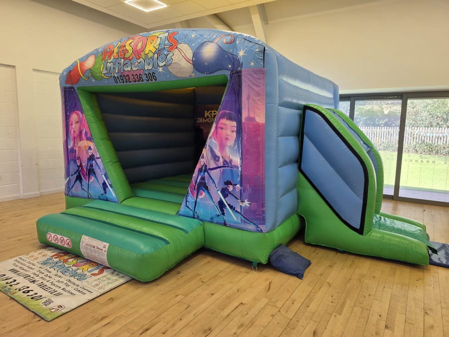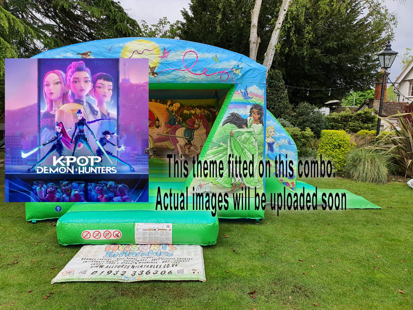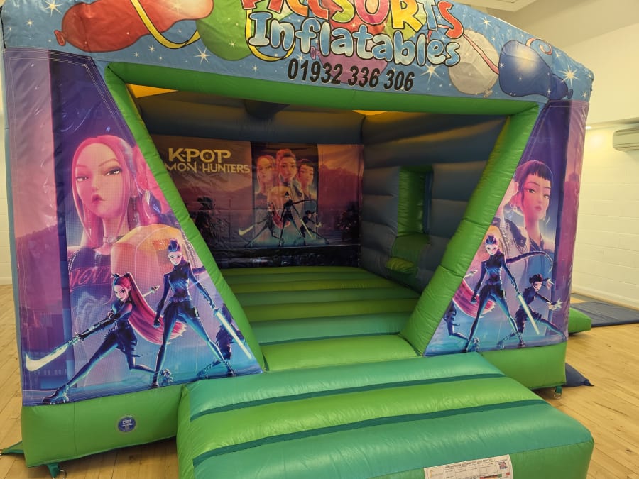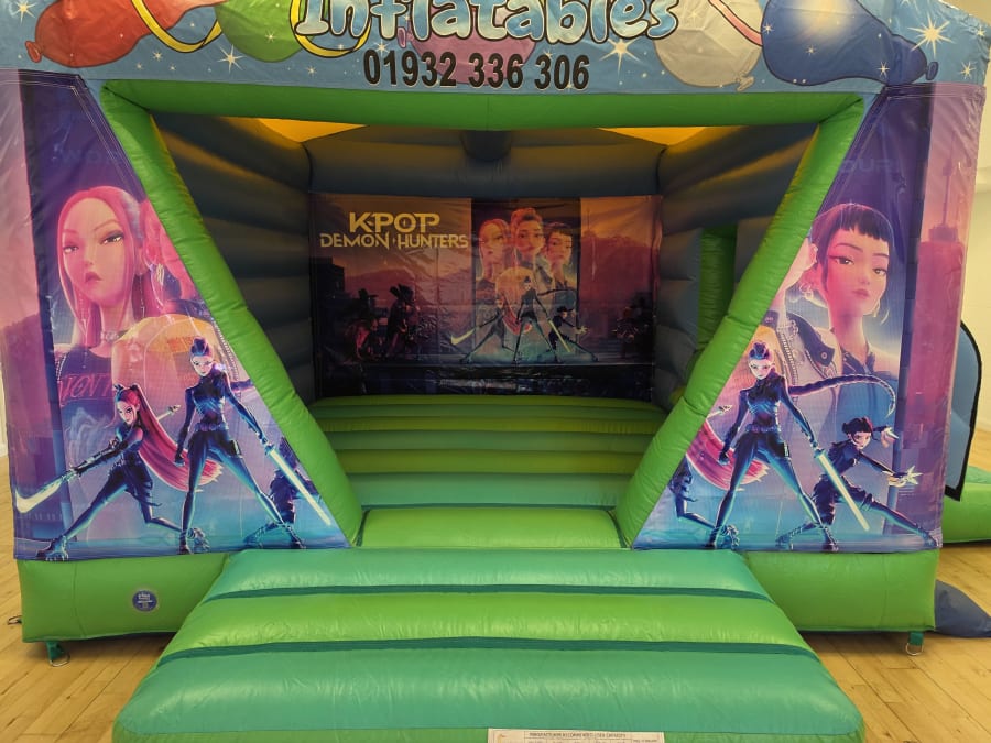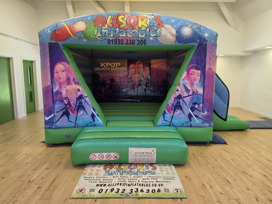 The K PoP Castle Slide Combo With Roof is a themed bouncy castle with a side slide designed for exciting parties and events. Bright K PoP styling, Demon Hunters graphics, and a built-in slide give kids two ways to play. Book with confidence for family parties, school fetes, and community events. K PoP Themed Bouncy Castle Slide Combo With Roof for hire in Surrey.