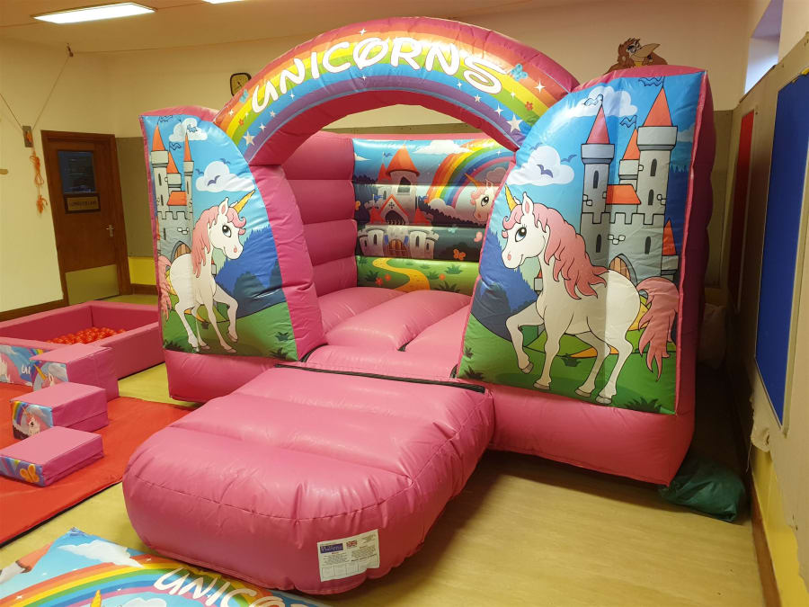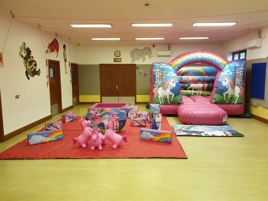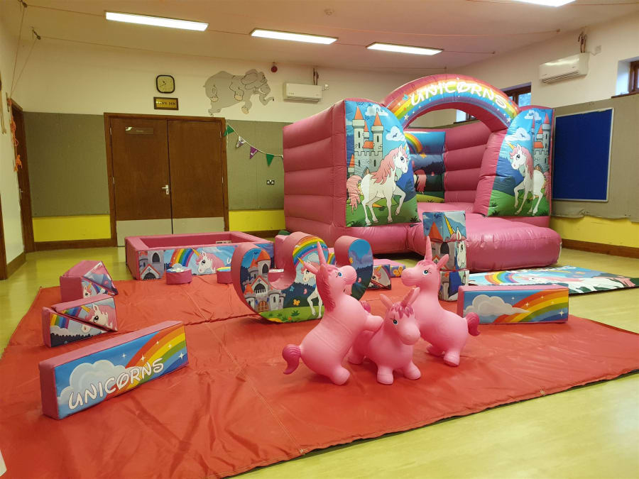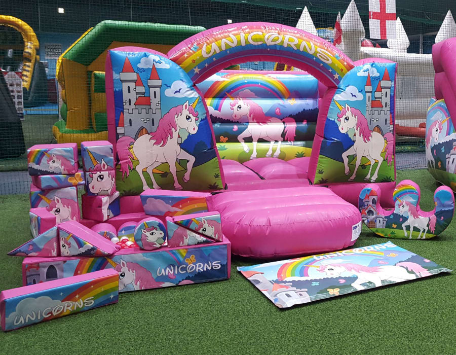 Unicorn bouncy castle, soft play & ball pond package for hire.