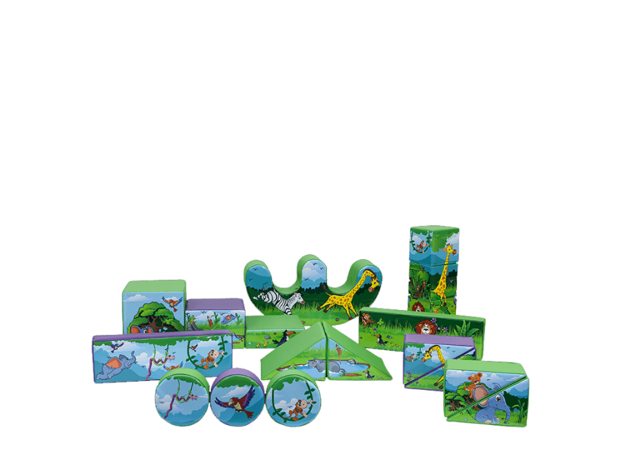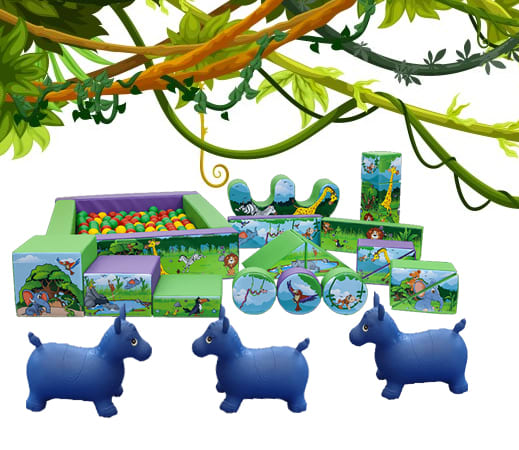 Package includes a 10ft wide x 12ft deep bouncy castle, 17 piece soft play set, 1 x double rocker, 3 x ride on animal hoppers and a foam ballpond with 300 balls, all beautifully themed with matching jungle artwork, and all laid out on a soft play mat.