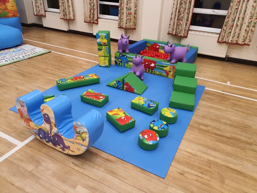 Package includes a 10ft wide x 12ft deep bouncy castle, 17 piece softplay set, 1 x double rocker, 3 x ride on dinosaurs and a foam ballpond with 300 balls, all beautifully themed with matching dinosaur artwork, and all layed out on a softplay mat.